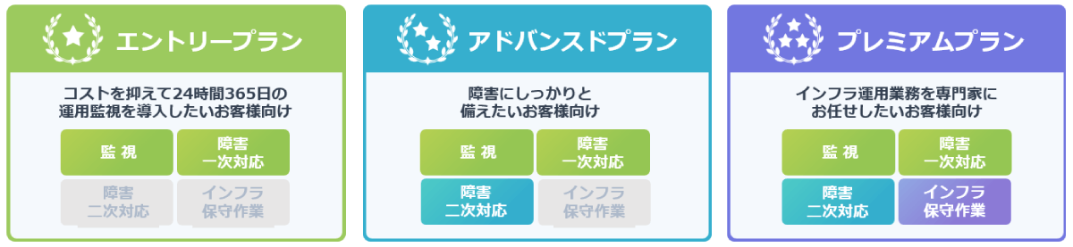 「アシストAWS運用代行サービス」は、AWS環境の監視・障害対応・運用保守までをワンストップで担うサービスです。具体的には以下のとおり、顧客ニーズに応じた3つのプラン(エントリー、アドバンスド、プレミアム)で提供します。