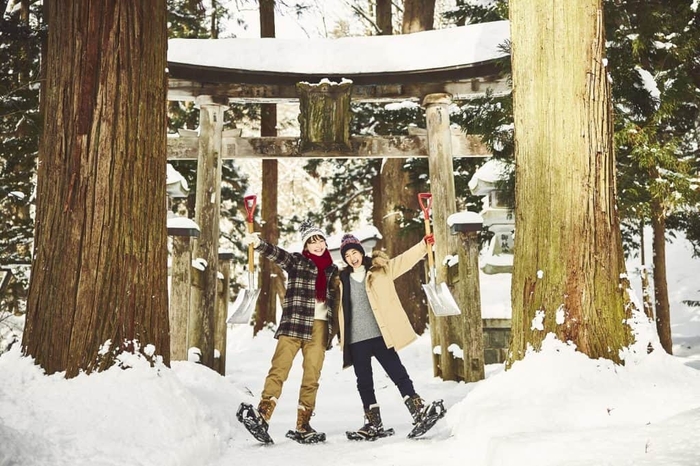 北東北二大霊山と呼ばれる雪深い「十和田神社」へ参拝するツアー。雪国ならではの体験として、雪に深く覆われた道をスノーシューで歩き、雪かきをして自らの道を切り開き、参拝をします。ツアー限定で「りんご輪紙」に御朱印を書いてもらうこともできます。