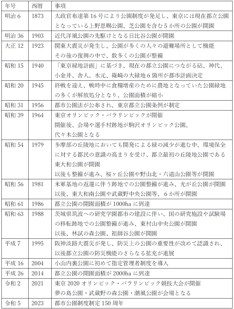 これまでの都立公園の歴史や果たしてきた役割を振り返りつつ、公園の魅力を発信し、更なる発展を図る機会となるよう、「東京都都市公園制度制定150周年記念事業」を国や関係団体と連携しながら進めていきます 。