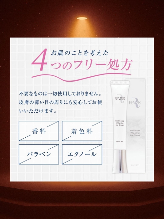 本製品は、有効成分「ナイアシンアミド」を配合し、シワの改善およびメラニンの生成を抑えてシミ・そばかすを防ぐ薬用アイクリームです。