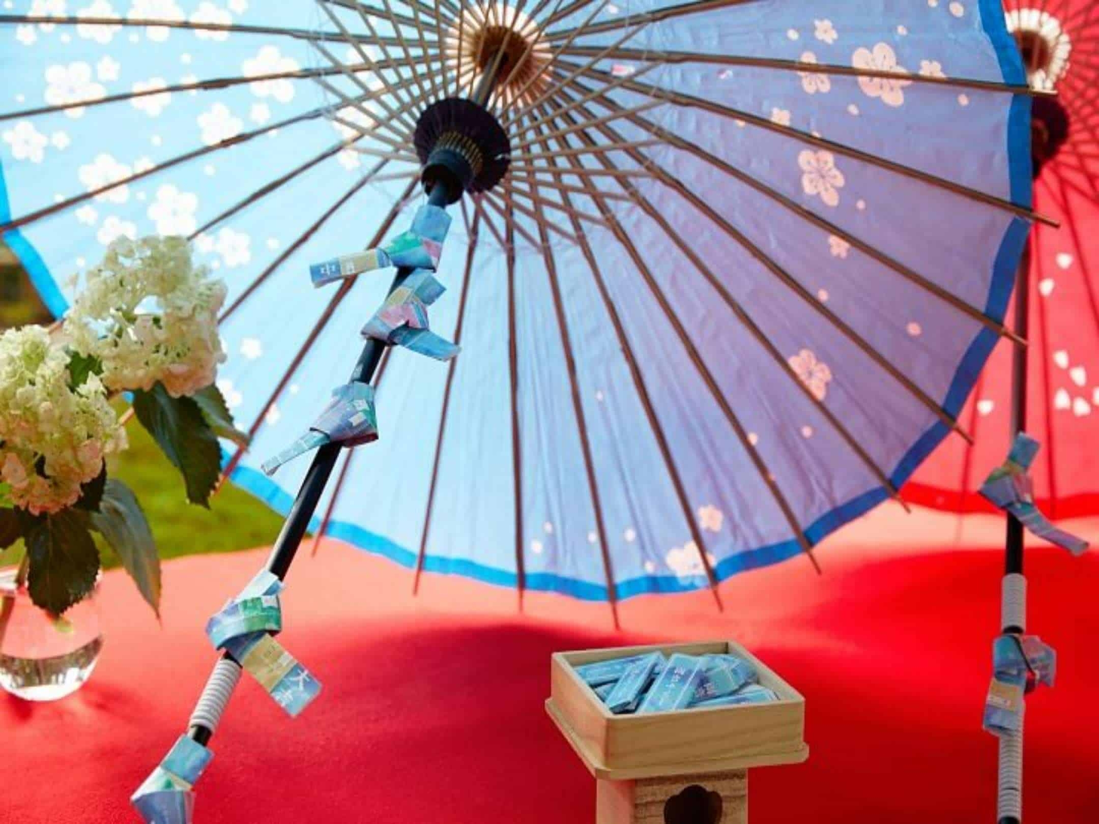 雨の日に欠かすことのできない和傘を、館内のさまざまな場所に彩り豊かに設えます。「和ンブレラスカイ」は、界 出雲のシンボルでもある太鼓橋の上に和傘を飾ることで、和紙の柄だけではなく、内部の骨組みの美しさを引き立たせます。雨の日に和傘をさしているような感覚を、館内に滞在しながら楽しむことができます。また、お食事処に隣接する竹庭と大浴場の露天風呂に設えた和傘は、日が暮れるとライトアップされ、お食事を楽しみながら、露天風呂に入りながら、色鮮やかな和傘が並ぶ幻想的な景色を堪能することができます。