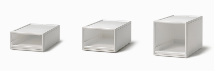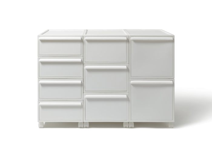 引出しタイプの人気色・オールホワイトとの合わせ使いで統一感ある収納システムに。