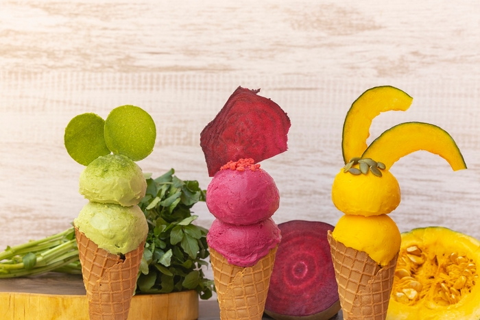 今年は、それぞれの夏野菜が持つ味わいを活かした「夏野菜のジェラート」が新登場します。クレソンのジェラートは、クレソンのほのかにピリッとする辛味と苦味に、ミルクと合わせることで、マイルドな味わいになります。ビーツのジェラートは、ビーツの自然な甘味を活かした味わいが特徴です。そして、かぼちゃのジェラートは、かぼちゃの香り豊かで濃厚な味わいが楽しめます。夏野菜の味わいと、夏にぴったりのひんやりスイーツを楽しめます。