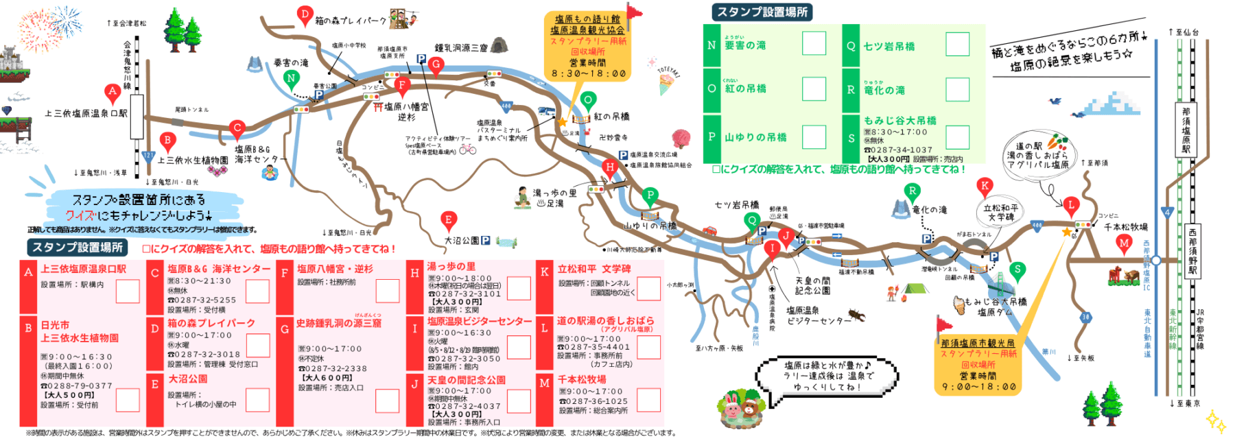 【イベント概要】スタンプ設置場所のスタンプを6個集めるとガラポン抽選会に参加できます。さらに、アンケートに回答すると抽選で2名様に塩原温泉3万万円分の宿泊券をプレゼント!