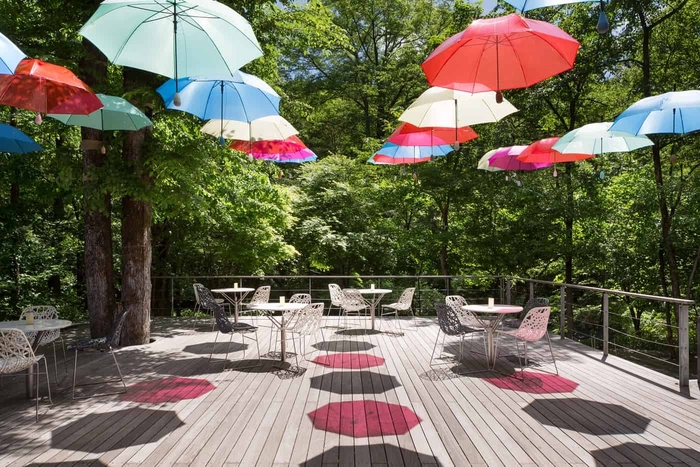 特徴1 新緑と空に映える、色鮮やかな傘の装飾