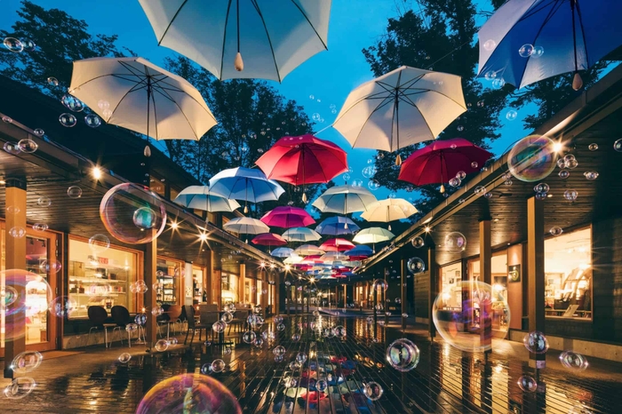 自然と文化を愛する人々が集う場所「軽井沢星野エリア」は、2023年6月2日~7月9日に、梅雨の時期に空を見上げたくなるイベント「軽井沢アンブレラスカイ 2023」を開催します。16のショップやレストランが集まる「ハルニレテラス」の街並みに、100本を超えるカラフルな傘を浮かべた「傘のアーケード」が登場します。昨年よりシャボン玉を空に浮かべる企画を始めました。今年は夜のライトアップ時にもシャボン玉を浮かべます。さらに、昨年イベント装飾に使用した傘をリサイクルする取り組みを開始します。
