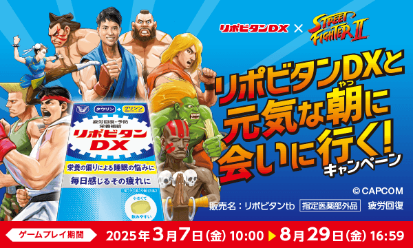 大正製薬株式会社は、『ストリートファイターⅡ』CPU対戦オリジナルゲームが楽しめる「リポビタンDXと元気な朝(やつ)に会いに行く!」キャンペーンを実施します。