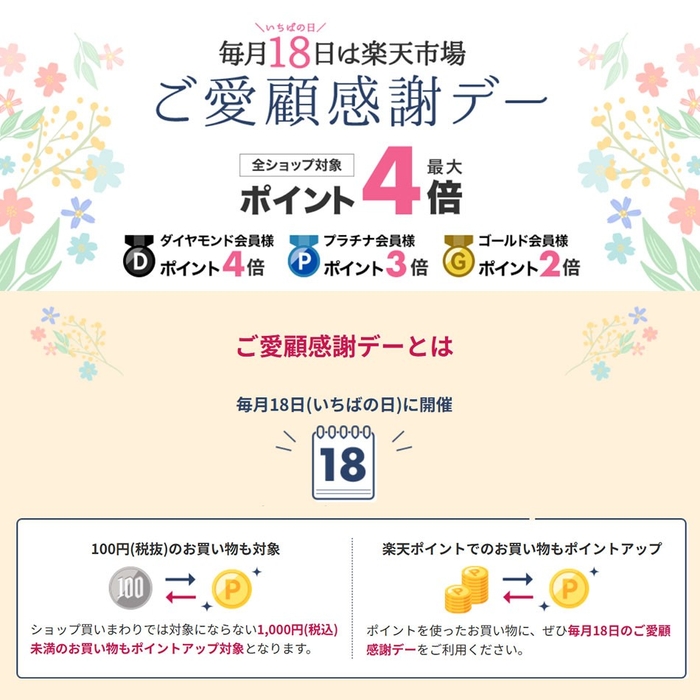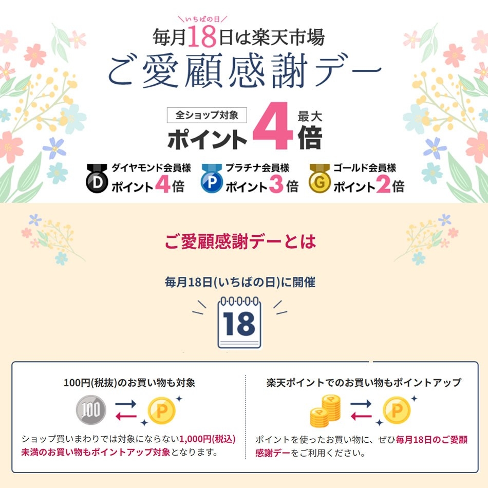 18日は、ゴールド会員ポイント2倍、プラチナ会員3倍、ダイヤモンド会員4倍の楽天ご愛顧感謝デー