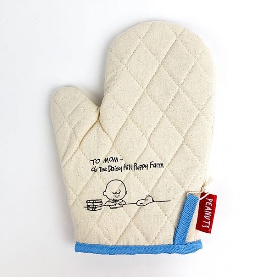 アイボリーの綿素材に、フェイスデザインのスヌーピーのイラストがかわいいキッチンミトンです。足跡のイラストもあってキュートですよね。