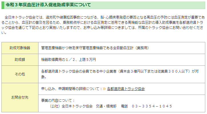 そしてこの度、4月9日、全日本トラック協会より、2021年度の血圧計の助成金開始されることが公表されています。補助率は 1/2、上限は5万円となっています。