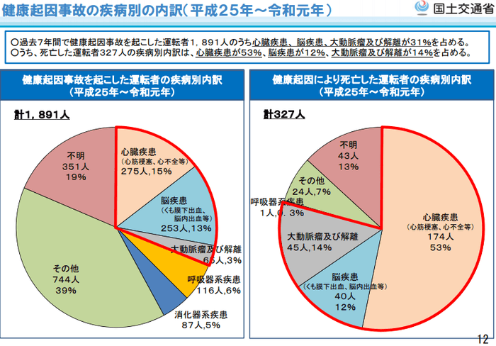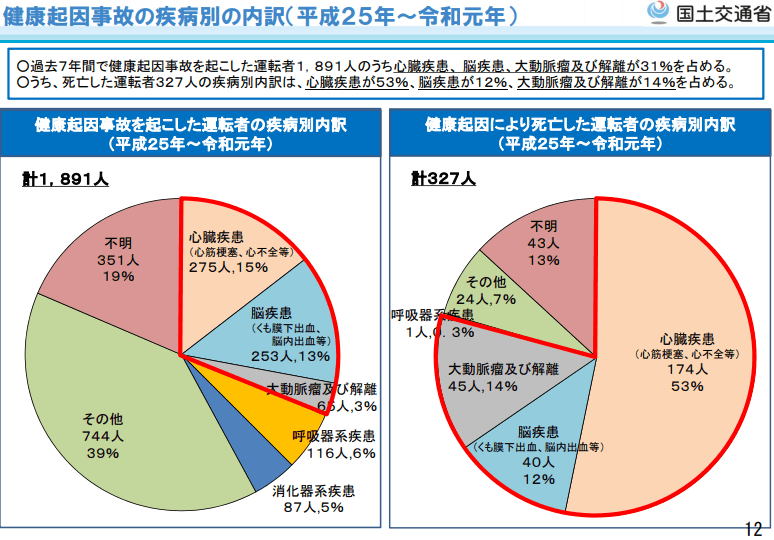 過去7年間で健康起因事故を起こした運転者1,891人のうち心臓疾患、 脳疾患、大動脈瘤及び解離が31%を占め、うち、死亡した運転者327人の疾病別内訳は、心臓疾患が53%、脳疾患が12%、大動脈瘤及び解離が14%を占めたとされています。