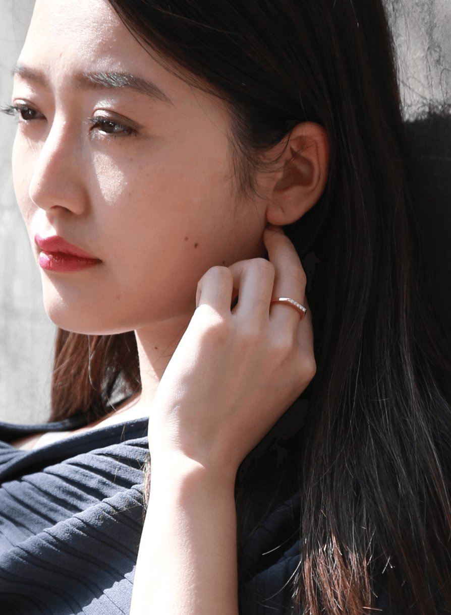 ダイヤを使用、且つ、直線や平面でデザインされた今回のジュエリーは、ダイヤならではのブライトネスな美しさとエキセントリックな雰囲気を兼ね備えています。