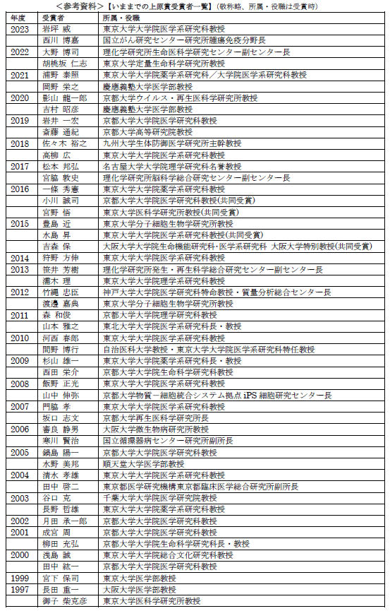 <参考資料>【いままでの上原賞受賞者一覧】(敬称略、所属・役職は受賞時)
