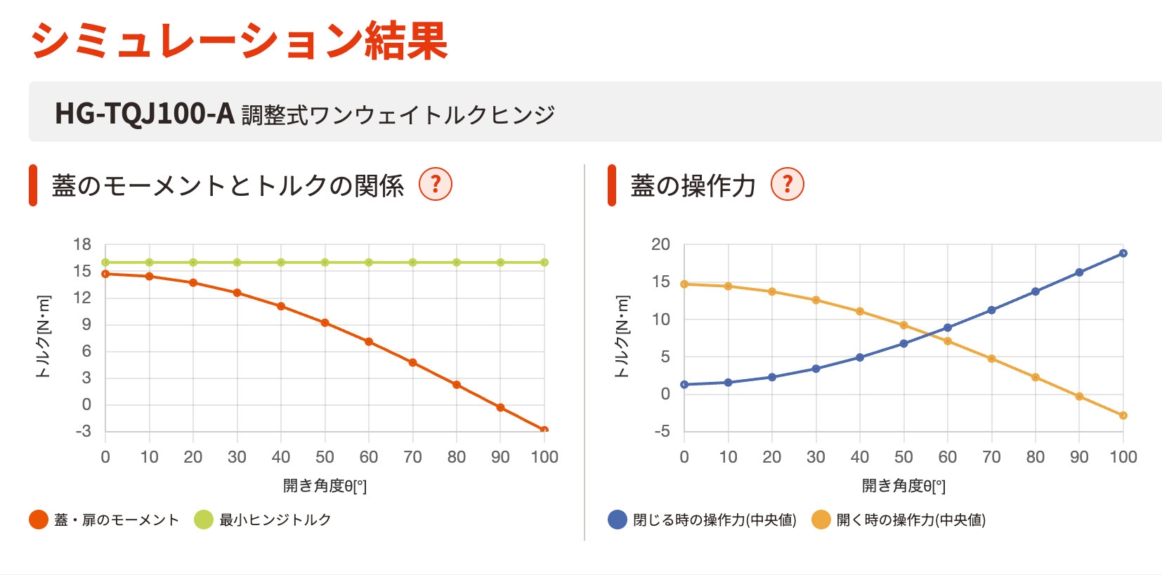 選定対象の内容をPDFで保存可能です。その他、モーメントや操作力も自動で計算し、開き角度による変化をグラフでシミュレーションできます。