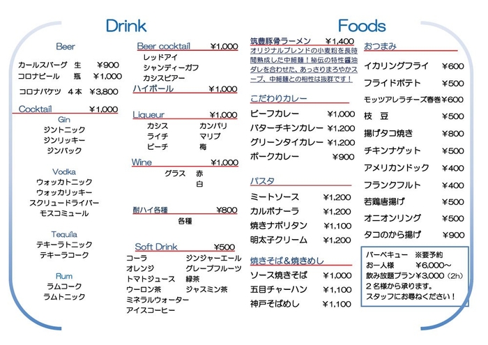 その他にも、カレーなどのごはん類やおつまみ、アルコールを含めた豊富なドリンク類など、真夏のビーチで堪能できるメニューが盛りだくさんで、予約をすればバーベキューも楽しめます!