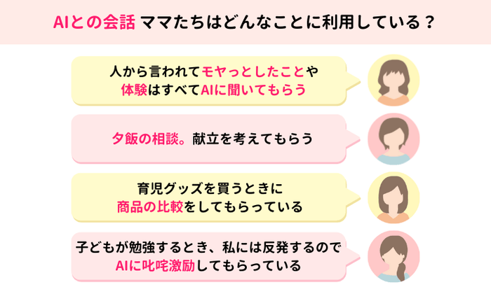 実際にママたちのコメントからも「子どもの勉強サポート」「家事の効率化」「健康や美容の相談」など、“身近な分野”での活用が広がっていることがわかりました。「難しそう」と思っていた人も、気づけば自然とAIと接している……そんな未来はすぐそこかもしれません。