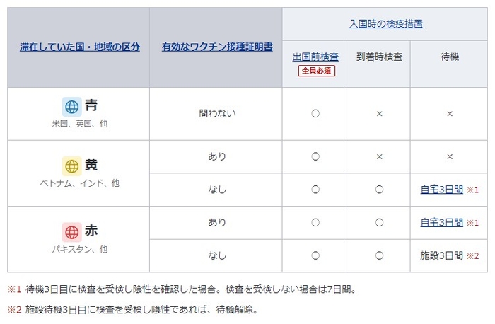 国・地域を3つの区分にし、すべての国・地域からの入国者について出国前検査を維持しつつ、フランスや米国など98か国・地域からの入国者は、入国時検査を実施せず、自宅待機等の待機も求めません。