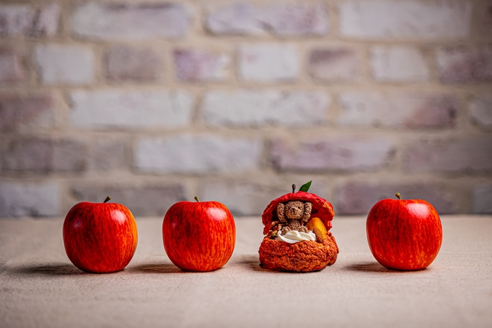 オプションスイーツの『くまさんのかくれんぼ』は、くまのチョコレートムースをりんごに見立てたシュー生地でサンドしたキャラメルカスタードクリームシュークリーム。りんごとハチミツのソースをかけてお召し上がりいただけます。