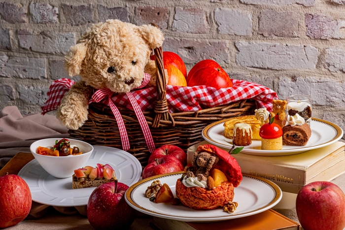 スイーツは主に季節のりんごや洋梨を使用した、キャラメルと洋梨のケーキやりんご型のムース、特製アップルパイ、爽やかな酸味のりんごバターでお召し上がりいただくスコーン、見た目に愛らしいテディベア型のアイシングクッキーなどをご用意。