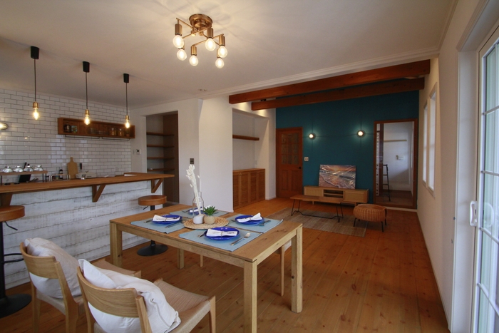 アメリカンファームハウスの佇まいに装飾的なディテールをプラス。窓枠、柱、梁、アイアン、アンティーク調の照明がクラシックな内装を演出し、温かみと個性を感じさせます。