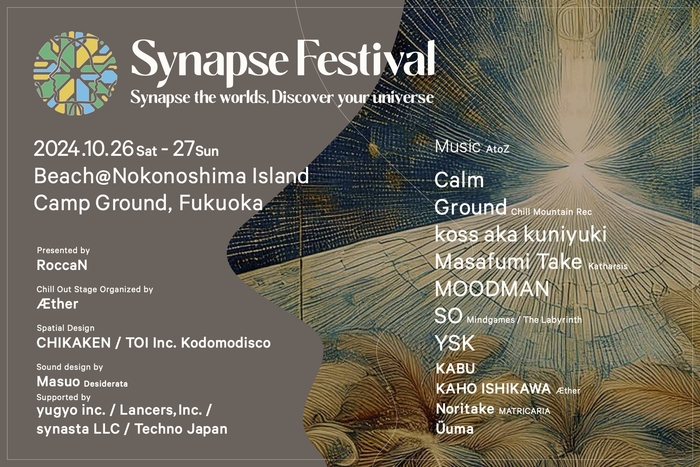 音楽ではCalm、Ground (Chill Mountain Rec)、SO(Mindgames / The Labyrinth)、koss aka kuniyukiなどの著名アーティストが、参加者の聴覚を満たします。また、会場の空間演出として、CHIKAKENによる竹あかりアートが視覚を彩り、「TRIP SAUNA」によるハーバルサウナが、能古島の自然とデジタルノマドの多彩なクリエイティビティを調和させます。