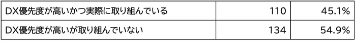 「経営管理・経営データ活用」領域のDXの優先度が高いと回答し、かつ実際にDXに取り組んでいると回答した方は半数以下の45.1%であった。優先度が高いと考えている企業でも、実際の取り組みまでは行えていない企業が54.9%と半数以上にのぼる結果となった。