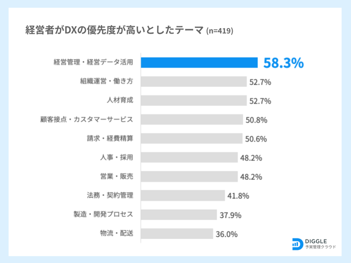 ・経営者の58.3%が「経営管理・経営データ活用」領域のDX優先度が高いと回答し10テーマの中でもっとも優先度が高い結果となった