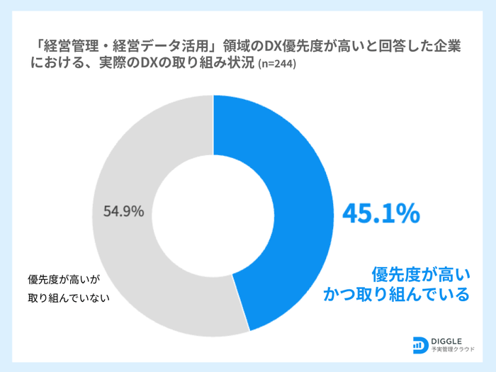 ・「経営管理・経営データ活用」領域のDX優先度が高いと考える企業の中で、実際にDXに取り組んでいる企業は半数以下となる45.1%であった。