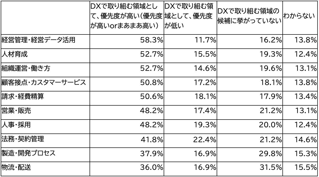 上記10テーマそれぞれに対するDXの優先度合いを聞いたところ、「経営管理・経営データ活用」領域については58.3%の経営者が優先度が高い(高いorまあまあ高い)と回答。10テーマの中でもっともDXの優先度が高い結果となった。