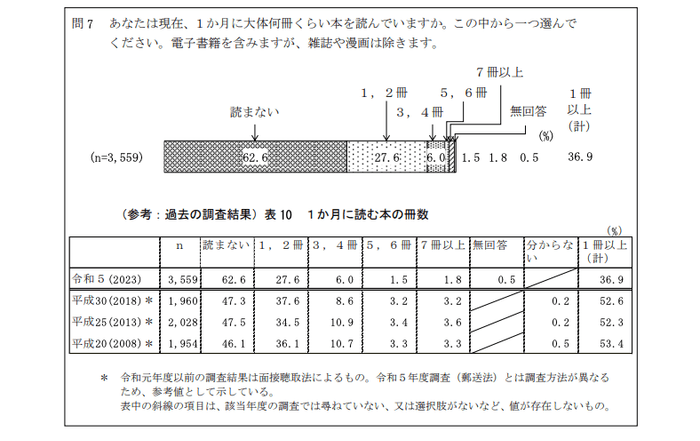 文化庁が実施した「令和5年度 国語に関する世論調査」によると、「1か月に読む本の冊数」の回答として、「読まない」が62.5%で最多でした。平成30年の調査では47.3%だったため、読書量の低下がさらに進んでいることがわかります。