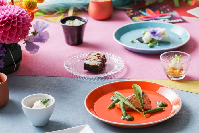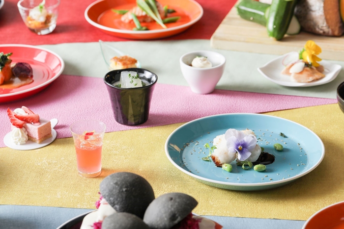 焼なすと愛知県産カラフルトマトのカッペリーニ/冬瓜とエピス香る 冷製ポタージュ/サーモンのプランチャ バジルのソース/白身魚のフリット スパイシーパン粉のアクセント/スズキのヴァプール ムケッカソース コリアンダーのアクセント