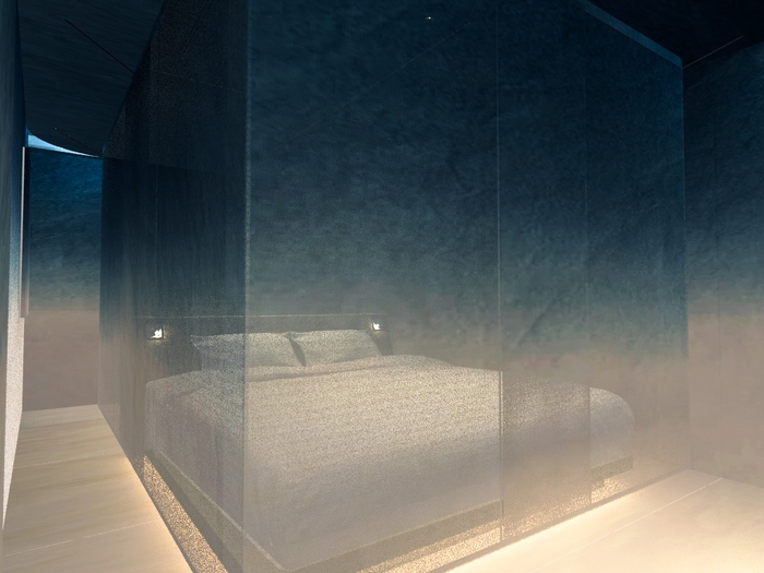 2階には、波打つ天井やヘッドボード照明によって光の波を表現した寝室と、左官の技術を用いて壁を仕上げた寝室の2つのベッドルームを備えています。3階には蚊帳をイメージした寝室を計画しており、「hitotose」シリーズのテーマである四季や日本文化を各部屋に反映しました。
