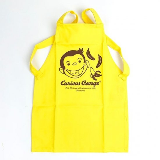 まずは、キッズエプロンのご紹介です。中央に大きく描かれたジョージがポイント。イエローカラーが魅力的なアイテムです。