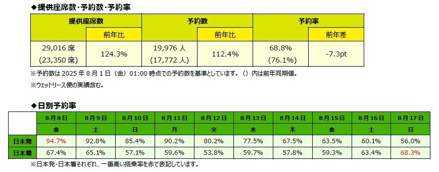 スプリング・ジャパン 2025年度 夏季繁忙期ご予約状況2025-08-01 16:00スプリング・ジャパン株式会社 2025年度 夏季繁忙期間(2025年8月8日(金)~8月17日(日))のご予約状況を取りまとめましたので、ご報告します。国際線国内線画像・ファイル一覧一括ダウンロード