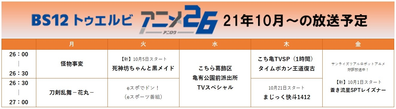 全国無料放送のBS12 トゥエルビ( 本社:東京都渋谷区、代表取締役社長:須磨直樹)では、平日26時台に新旧アニメの名作・話題作をお届けする放送枠『アニメ26(アニロク)』を放送しております。10月からも話題作、注目作をお届けします。