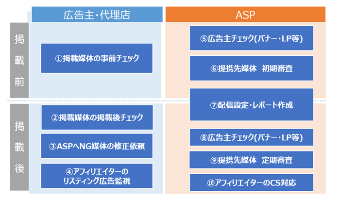 こうした背景から、消費者庁より(※1)、「アフィリエイトプログラムを利用した広告を行うような業態では、当該広告を利用する事業者がアフィリエイター等の作成する表示等を確認することが必要となる場合があることに留意する必要がある。」との発表があり、ASP事業者だけでなく、広告主もアフィリエイト広告の表示内容を確認する必要があることが示唆されています。