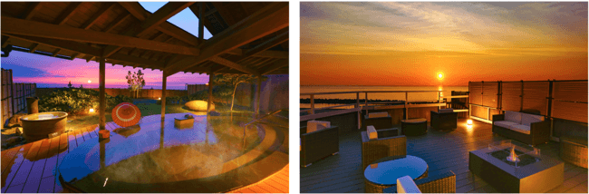 左:海面を赤く染める夕日を眺め、海から吹く風を頬に感じながら楽しむ天然温泉で極上のひと時を。
