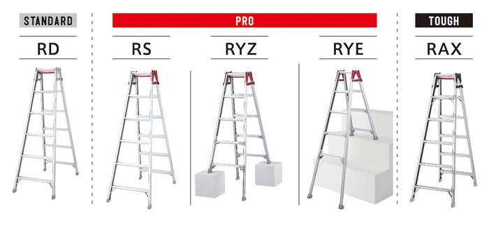 使用環境は建設現場などのプロユース。毎日使う方を想定し、脚部伸縮脚立や階段で使える脚立など現場での実用性が高い製品がラインナップ