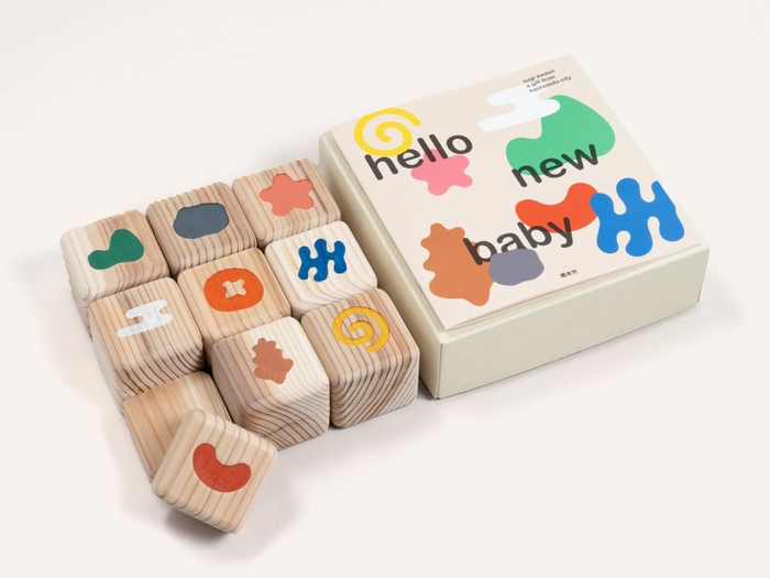 このおもちゃは橋本市で育った杉を使って作られています。ひとことに杉といってもひとつひとつの木には個性があり、木目や色、繊維の詰まり具合などが木ごと、または部位によって異なります。何かこれらの個性を活かしたものを作ろうと考えていたときに、貝合わせという日本の伝統的な遊びを思い出しました。同じように見える貝殻はふたつとして同じ組み合わせはありません。杉の木も木目に沿って割ることで、ひとつひとつが違う形に割れ、唯一の組み合わせが生まれます。その組み合わせに橋本市で生まれた子どもが周りで認識していくであろう形(山や川、石ころなどなど)をイメージして、9つの図案を彫り込みました。形はあえてはっきりしたものではなく、見る子どもによっていろいろなものを想像できるような抽象的な形にしました。小さい子どもは絵あわせや積み木として、少し大きくなったら木目だけを見て組み合わせを当てる神経衰弱のような遊びとして、年齢ごとにいろいろな遊び方を試してもらえると嬉しいです。