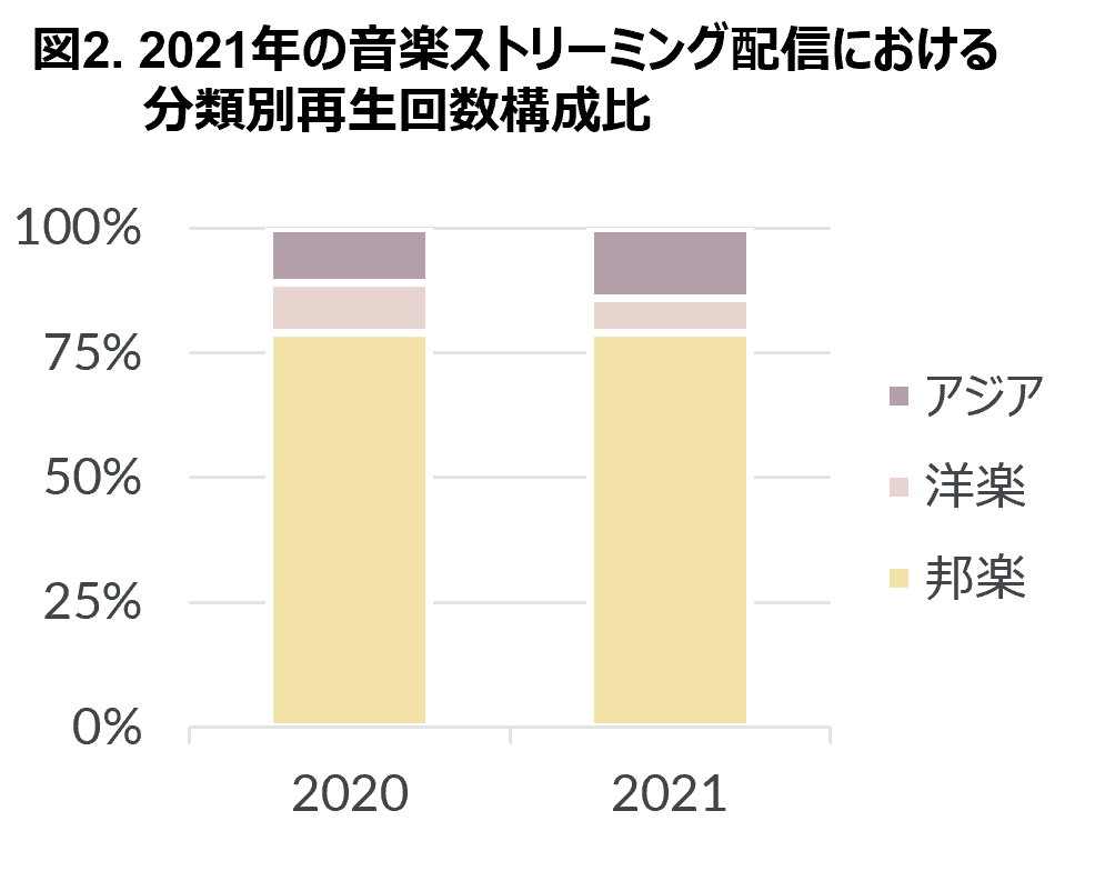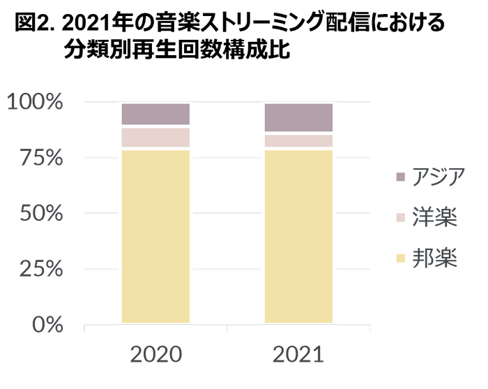 邦楽・洋楽・アジアの分類別に動向*2をみると、邦楽は前年と比較して横ばいで安定して大きなシェアを占めた。アジアのシェアは前年比で堅調に伸びた一方、洋楽が縮小傾向だった。再生回数構成比では邦楽が8割弱、洋楽が1割弱、K-POPを含むアジアは1割強を占めた(図2)。