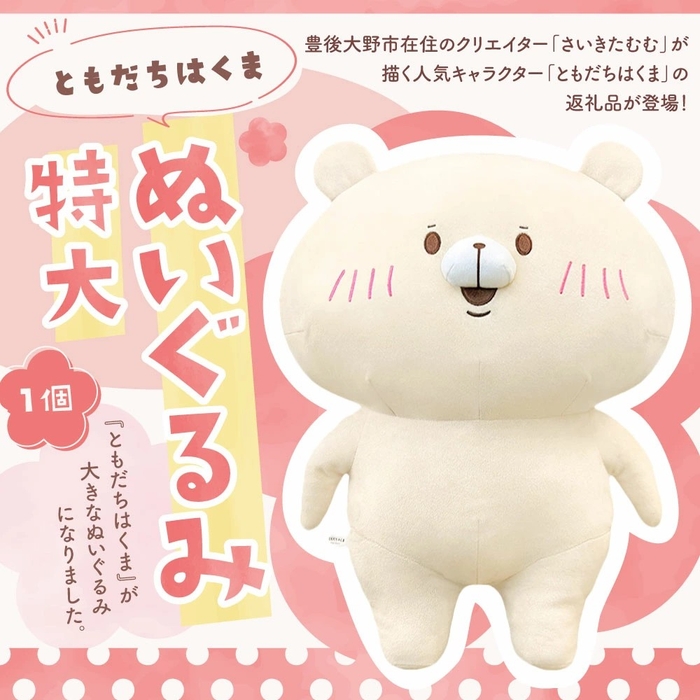大分県豊後大野市のふるさと納税返礼品に、エイノバ株式会社(本社:東京都千代田区、代表取締役社長:安倍義人)のマネジメントする人気クリエイター「さいきたむむ」が描くキャラクター「ともだちはくま」の特大ぬいぐるみが新たに登場しました。約55cm×40cmのビッグサイズで、ふわふわの布生地を使用し、見る人をほっこりと癒す温かみのあるデザインが魅力です。SNSでも話題のシュールでかわいいキャラクターをぜひお手元でお楽しみください。