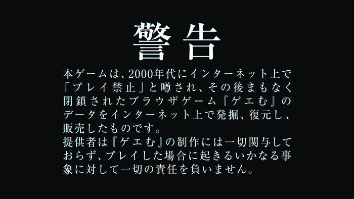 2000年代にインターネット上で「プレイ禁止」と噂され、その後まもなく閉鎖された都市伝説的ブラウザゲーム『ゲエむ』。本作は、そのデータを発掘、復元し、販売したものです。提供者であるSCRAPは『ゲエむ』の制作には一切関与しておらず、プレイした場合に起きるいかなる事象に対して一切の責任を負いません。取り扱いには十分に注意してください。