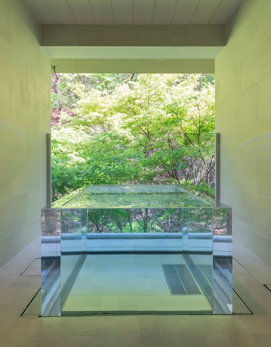 天を表象する客間は空(くう)をイメージする透明でミニマルな水の立方体の浴槽によるプリズムからの虹が視覚的な天を表現している。洋間の菊の作品の壁とイカロスの回廊の壁は和紙職人・ハタノワタル氏にお願いした。