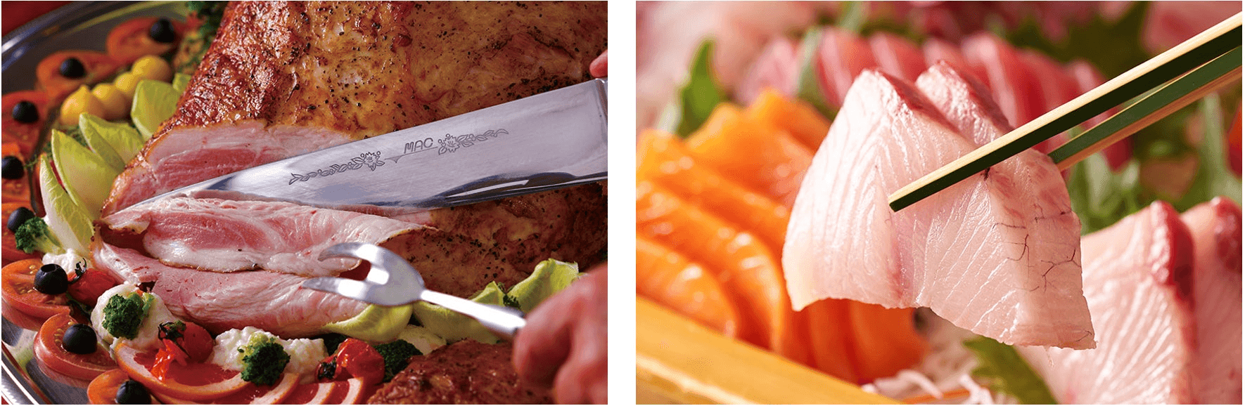 左:低温でじっくりと火入れしたローストポークには、はちみつが隠し味のマスタードソースを添えてご賞味ください。