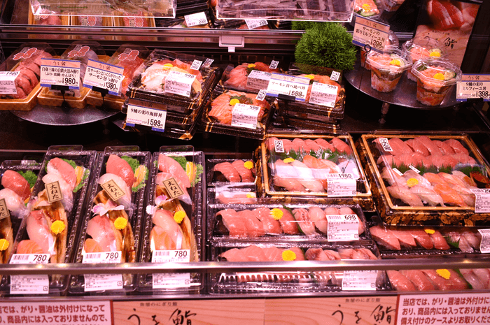 新鮮な大ネタを使用した魚屋の寿司「うを鮨」。店内でネタを炙った商品も並びます。