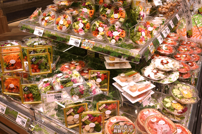 旬の食材や国産の野菜を店内で衣付けし、キャノーラオリーブ油でカラッと揚げた天ぷらを対面で販売いたします。その隣には好きな量を購入できる量り売りのサラダコーナーも設置いたします。