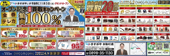 全国で115店舗展開する「買取専門店さすがや」が、 2025年11月5日、愛媛県今治市にグランドオープンいたします!