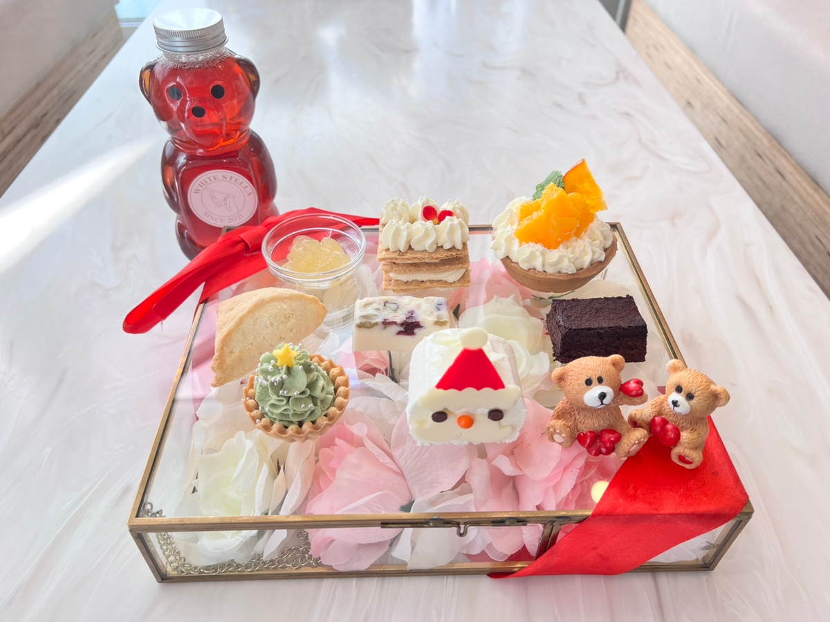 今回のクリスマスアフタヌーンティーからサンタロールや抹茶タルトなど可愛らしいデザートと通常メニューからミルフィーユとオレンジタルトをご用意しております。
