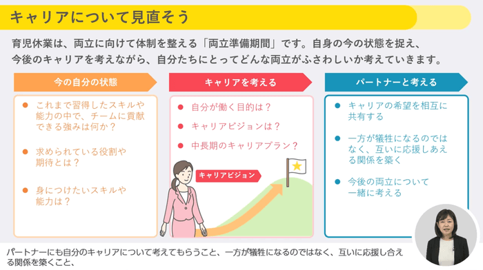 ●「産休前」「休業中」「職場復帰後」それぞれのフェーズでキャリアについて考えるよう促し、休業取得をふまえたキャリアの考え方、キャリアプランをふまえた休業中の有意義な過ごし方、そして職場復帰後もプロとして成果を出していくための両立のポイントが学べます。