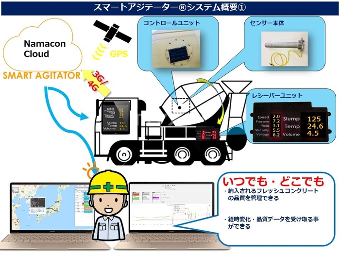アジテーター車ドラム内の生コンクリートの状態(スランプ、コンクリート温度、積載量等)をリアルタイムに計測、記録し、インターネット回線が使用可能な環境下において、何時でも何処からでも確認することが可能なシステムです。土木工事および建築工事において、普通コンクリートをはじめ、高流動コンクリート、再生骨材コンクリート、環境配慮型コンクリート等の各種コンクリートの運搬から荷卸し時の品質確認での多数の採用事例があります。